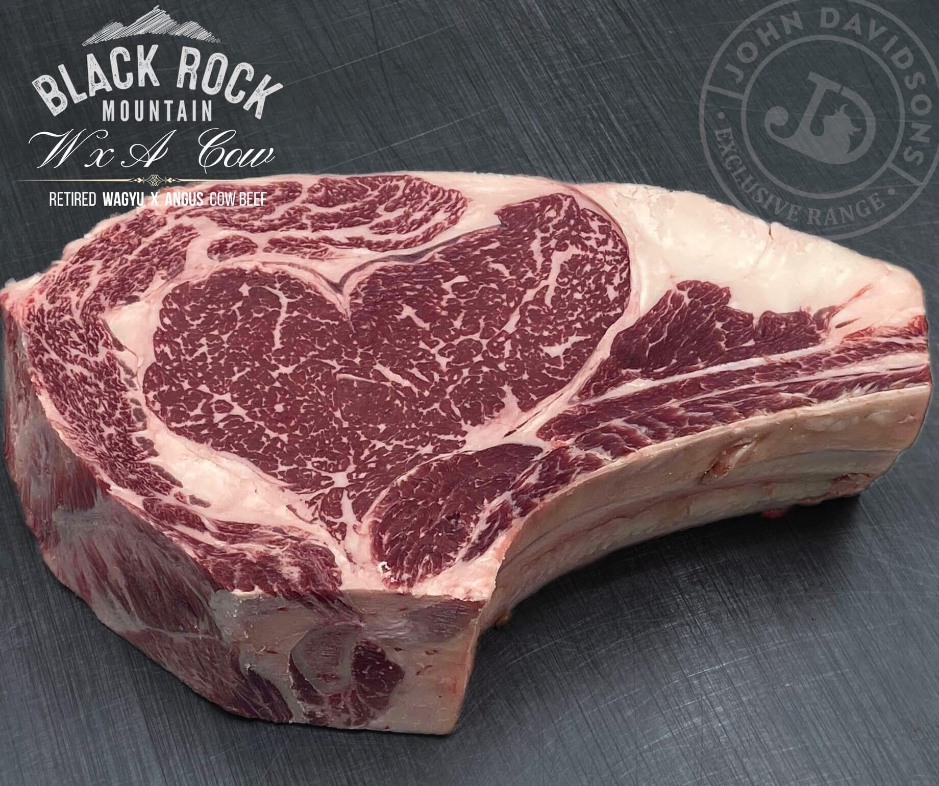 Introducing the Prime Rib Steaks from our Black Rock Mountain range—a thick-cut favorite that’s perfect for sharing and packed with rich, juicy flavour. Sourced from retired Wagyu x Angus Cows (WxA), these Prime Rib Steaks bring together the luxurious marbling of Wagyu and the bold, hearty taste of Angus for an unforgettable dining experience.