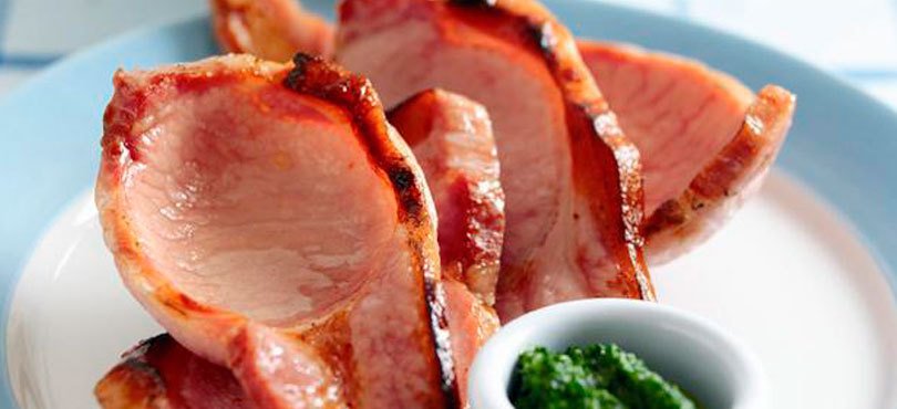 Serve the bacon chops with a pile of mash and spoonful of pesto.