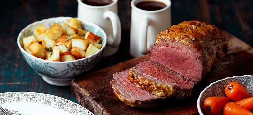 Slice the roast and serve with gravy, mini sauté potatoes and seasonal vegetables.