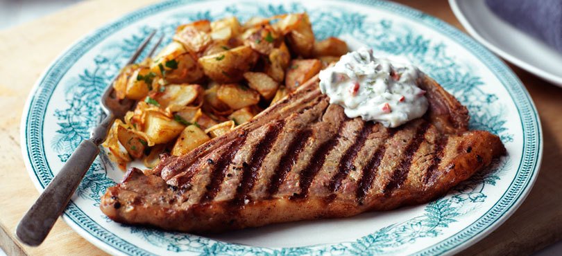 Serve the steaks with the flaming mayonnaise and sauté onions and potatoes.