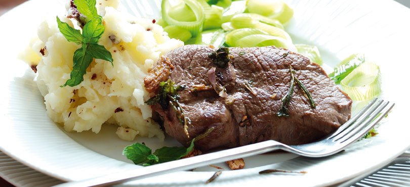 Serve the lamb steaks with mashed potato mixed with crumbled black pudding and stir-fried leeks.