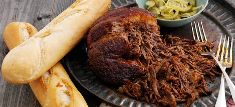 This brisket joint is cooked is cooked very slowly in a low oven, tomatoes, barbecue sauce, honey, Worcestershire sauce, stock and smoked paprika. The tender meat is ‘pulled’, before it is shredded to serve.