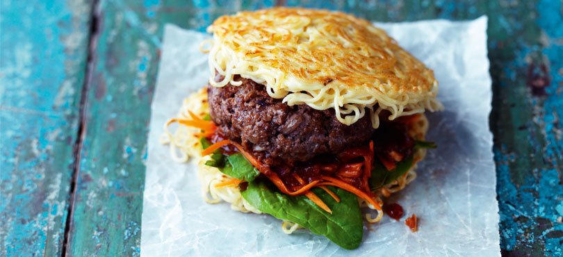 A Japanese beef burger that replaces the burger bun with a noodle bun! Tomato sauce is replaced with a tonkatsu sauce made with red onions, mustard, light soy sauce, tomato ketchup and fresh root ginger.